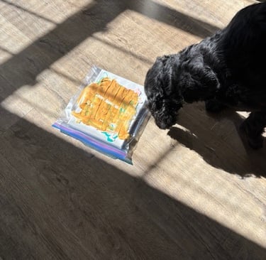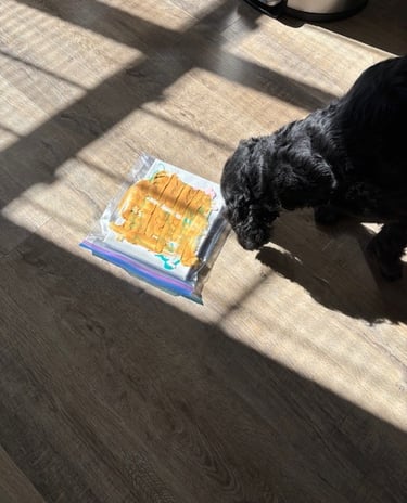All you need is a blank canvas, a one-gallon freezer bag, some acrylic paints, and a spoonful of dog safe peanut butter (no xylitol!). Spread peanut butter thinly and evenly on the outside of the freezer bag. Choose your paint colors and place dollops of paint on the canvas – be sure to strategically space the paint for optimal color and blending. Place the canvas in the freezer bag and make sure it is sealed tightly. Once the bag is closed and secure, place it on the floor and watch your dog create a masterpiece while he/she enjoys some delicious peanut butter.